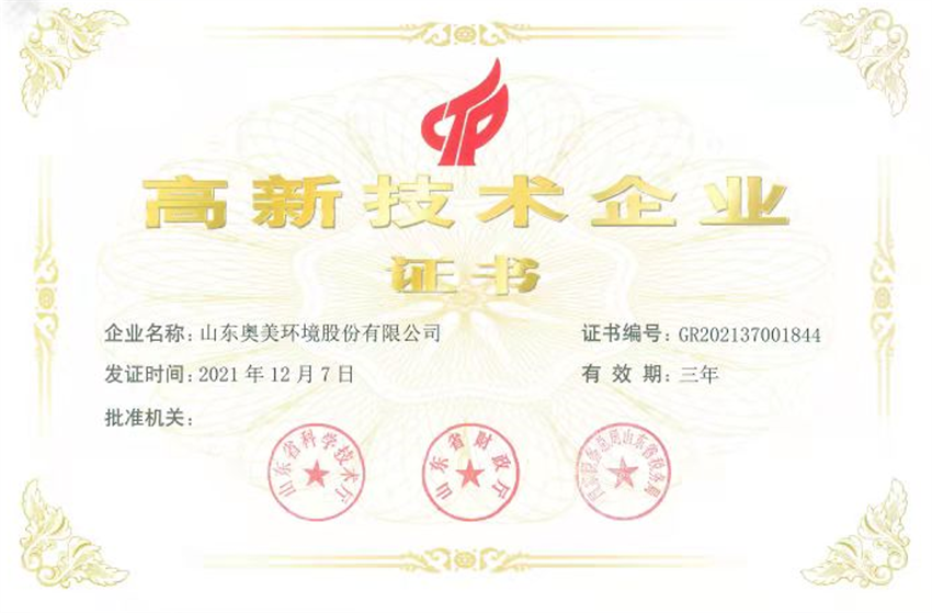 近日我公司再次收到“高新技術(shù)企業(yè)”證書,證書編號:GR202137001844, 該證書由山東省科學(xué)技術(shù)廳、山東省財政廳、國家稅務(wù)總局山東省稅務(wù)局聯(lián)合頒發(fā)。國家高新技術(shù)企業(yè)門檻較高,認(rèn)定須經(jīng)過嚴(yán)格的測評和審批程序,奧美環(huán)境憑借過硬的技術(shù)實(shí)力再次榮獲高新技術(shù)企業(yè),這標(biāo)志著公司在研發(fā)和創(chuàng)新方面得到認(rèn)定。這是對公司在核心自主知識產(chǎn)權(quán)、科技成果轉(zhuǎn)化能力、研究開發(fā)的組織管理水平、成長性指標(biāo)和人才結(jié)構(gòu)的綜合評估和認(rèn)定。我公司能再次獲得認(rèn)定,說明公司在創(chuàng)新研發(fā)方面得到國家的大力支持和認(rèn)可,同時積極推動了公司自主創(chuàng)新、自主研發(fā)的進(jìn)程。
