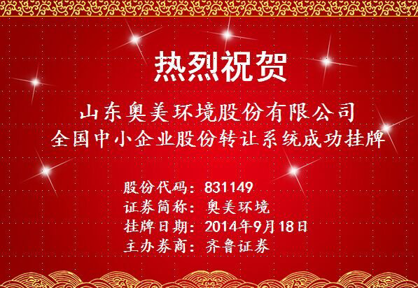 今天是2014年9月18日,山東奧美環(huán)境股份有限公司(Shandong AMS Environmental Co. , Ltd.)在全國中小企業(yè)股份轉(zhuǎn)讓系統(tǒng)成功掛牌,股票簡稱: 奧美環(huán)境;股票代碼:831149.